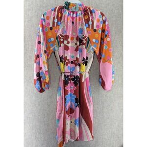CIEBON XS 70s Style Psychedelic Print Smocked Neck Long Sleeve Mini Dress