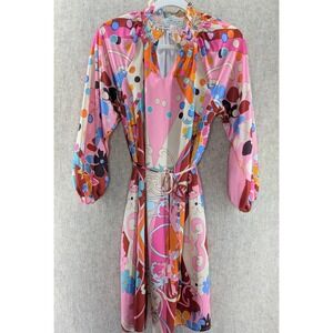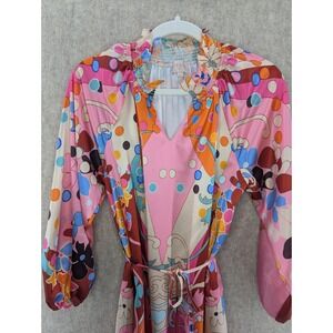 Keywords: psychedelic, 70s, retro, smocked, blouson sleeves, tie waist, mini, boho, festival, vacation, colorful, print, unique