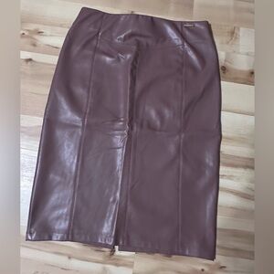 Soft leather skirt, mauve/pink color. Thick elastic waist band. Nice quality with cloth on the sides of the back and a small slit in the back. Size Medium. Like brand new.