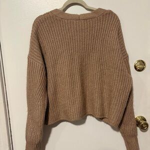 Tan cropped cardigan with button front and long sleeves. Size: L