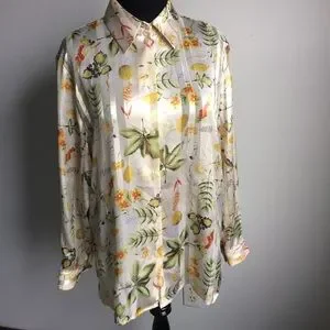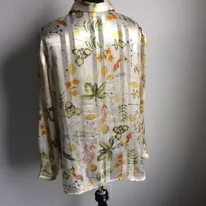 Gently used condition. Care tags and size have been removed but am basing 1X on similar shirts, however see measurements. Has a great nature- leaves, flowers and berries- print. Subtle stripes. Comes from a smoke and pet free home.