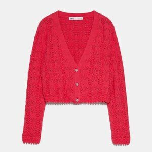 Zara Rhinestone Pointelle Knit Cropped Cardigan Sweater Fushia Pink Size Small