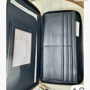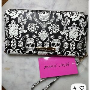 Chic wristlet with skull and rose design. Includes wrist strap for easy carrying.