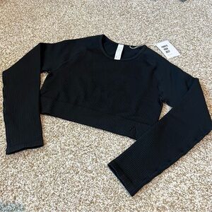 Black long sleeve, black cropped long sleeve, cropped long sleeve workout top, cropped workout top, black workout top, neutral workout shirt, neutral workout shirt, acta workout top, acta crop top, lululemon workout top, lululemon crop top, long sleeve crop top, gymshark crop top, gymshark long sleeve, seamless long sleeve, cropped long sleeve