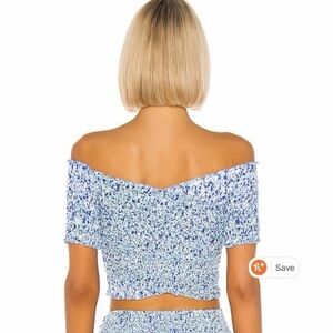 Chic Poupette st Barths smocked off-shoulder crop top with a blue floral pattern.