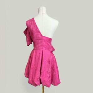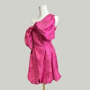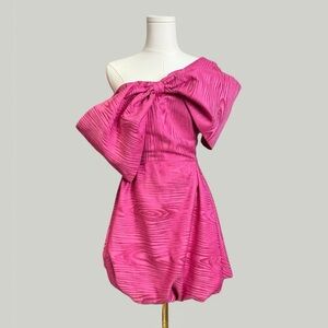 features to note: color in pink with cool circle patterns / one shoulder / big bow detail on the front / balloon bubble mini skirt / zipper closure on the side