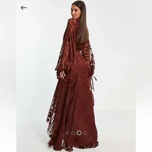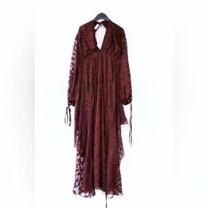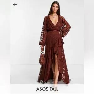 Elegant brown wrap dress. Features long sleeves and a deep V-neck. Asymmetrical hem adds flair.