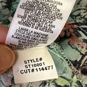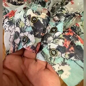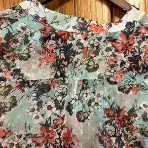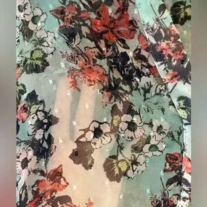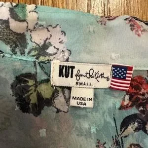 Kut from the Kloth women’s semi sheer aqua blue / light teal chiffon blouse with Swiss dot texture detail and floral pattern. Half button up style with high low hem silhouette.