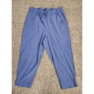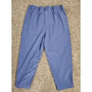 This Talbots women's light blue pants in size Petite Large feature an elastic waist and drawstring closure for a comfortable fit. The pants are designed for a relaxed fit with a cropped style and straight leg, making them perfect for casual or travel occasions during the summer, fall, or spring seasons.