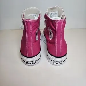 Keywords: Converse Chuck Taylor, Platform sneakers, High top shoes, Pink shoes, Fashion footwear, Casual sneakers, Streetwear, Comfortable shoes, Trendy sneakers, Everyday wear, Bold color