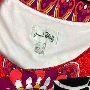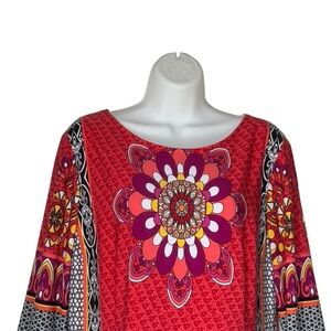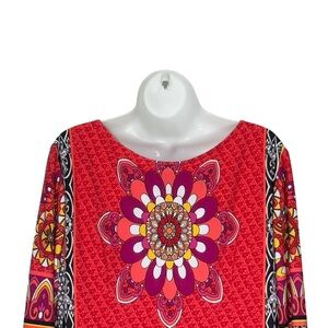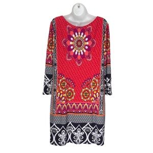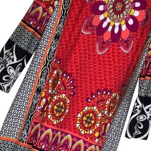 Turn heads in this vibrant Joseph Ribkoff dress featuring a bold fusion of patterns and colors. The centerpiece is a striking red mandala floral design accented with pink, yellow, white, and black, while the sleeves and hem showcase contrasting black-and-white geometric and floral motifs. With a flattering round neckline and three-quarter sleeves, this dress offers both comfort and standout style—perfect for artful evenings or upscale daytime events. Fabric tag has been removed. Hand wash and hang to dry.