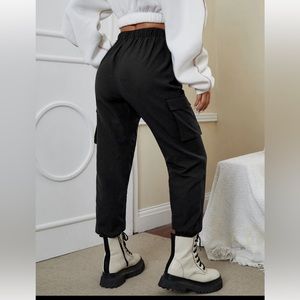 Women’s Chain Detail Flap Pocket Black Cargo Pants in like new condition, used once and washed, size petite XS, however it fits like size Petite Small. Measurements: waist 12.5” (elastic), length 36”, inseam 25.5”. ***Bundle to save on shipping and get 10% discount. The discount will appear automatically in your basket if you have 2+ items from my closet.