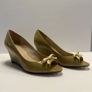 Kate Spade “Tracey” nude patent leather peep-toe wedge shoes featuring the brand’s signature cream bow detail. Designed with a sleek patent finish and a comfortable wedge heel, this style offers polished height with added stability. The neutral color makes these easy to style with dresses, skirts, or tailored pants, while the peep-toe silhouette keeps them light and seasonally appropriate.