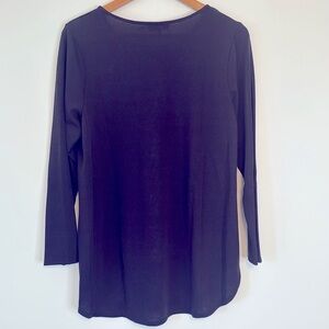 This designer Calvin Klein tunic top for women in black features a crew style neckline and 3/4 sleeves, perfect for a casual yet stylish look. Measures 18.75” underarm to underarm; 28.25” length. Great used condition!