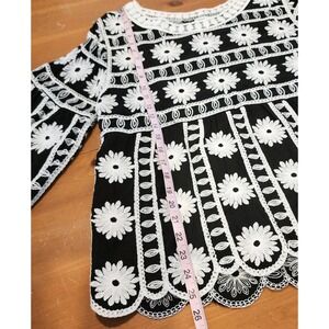 Kindred Top Womens XL Black White Daisy Scallop Bell Sleeve Boxy Flowy Boho NEW