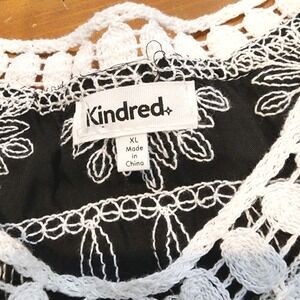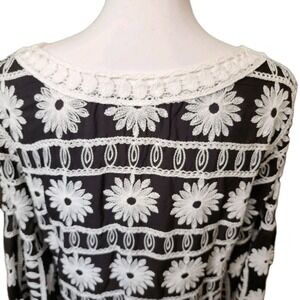 This top from Kindred is adorable in a black and white embroidered daisy pattern for size XL. There is a crochet pattern at the neckline, bell sleeves with a scalloped hem and a scalloped hemline at the bottom. This top has all of the Boho vibes and it's in new with tags condition so purchase with confidence!