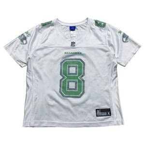 PreOwned in excellent condition Reebok NFL Seattle Seahawks Matt Hasselbeck No. 8 Women’s Jersey. Light wear, white, sparkle print Hasselbeck name and 8 on back in green, 8 and small Seahawks name above it on front, Seahawks logo on sleeves in grey with Reebok logo above it in green, 8 on shoulders, NFL shield on collar, Reebok jock tag, women’s sporty throwback! Hasselbeck played QB for the Seahawks from 2001-2010.