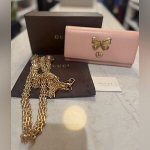 Beautiful Gucci GG Marmont Gold Butterfly with crystals wallet Pink (Rare) Like New Only worn ones come with box dust bag and cards,g unbranded gorgeous gold chain so you can wear as a bag please see pic for serial # 100% Authentic Measurements approximately Length: 19cm, width: 2.5cm, height: 9.5cm