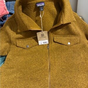 Warm Patagonia jacket in golden brown. Features a soft collar, fleece lining , zipper front and 2 button front pockets..