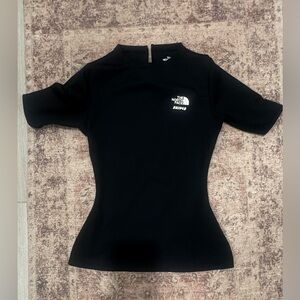 Sleek black tee with short sleeves. Features The North Face logo. Ideal for casual wear.