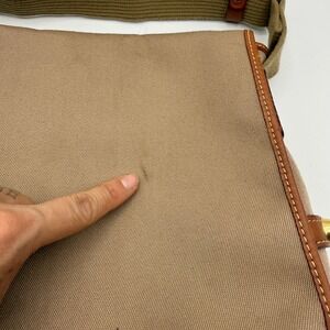 Keywords: Dooney Bourke, messenger bag, canvas bag, leather accent, crossbody, tan bag, everyday bag, travel, casual style, adjustable strap, outdoor, day bag, work bag