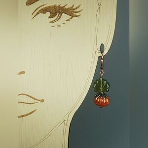 Handcrafted autumn earrings with artisan glass pumpkin beads and green leaf accents. Cute fall harvest style—perfect for seasonal outfits, Thanksgiving, or unique artisan gift giving. For pierced ears.