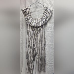 Stylish jumpsuit with navy and white stripes. Features a wide collar and sleeveless design. Perfect for casual outings.