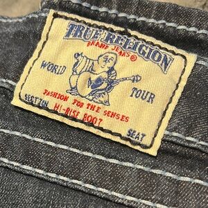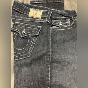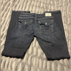 Almost new Dark Blue Denim True Legion Boot Cut Jeans. Accented with light blue thread and blue sparkly diamond on buttons. These jeans can be dressed up or down! style & boot cut with 32” inseam .