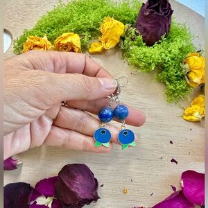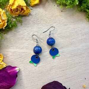 These handcrafted earrings feature deep blue Lapis Lazuli beads paired with charming blueberry accents—creating a piece rich in symbolism, intuition, and soulful expression.