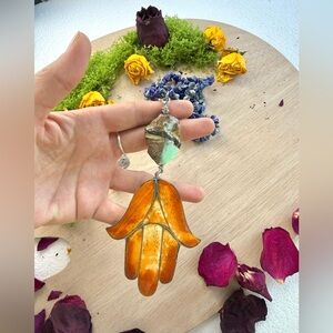 The Hamsa is an ancient symbol of protection, blessings, and divine guidance across many cultures. Crafted from copper and bone, then hand-dyed with henna, this charm carries layers of symbolic meaning:
