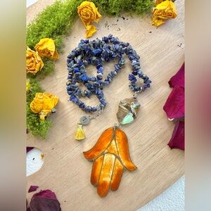 This handcrafted necklace combines the ancient wisdom of Lapis Lazuli, the heart-healing energy of Chrysoprase, and the powerful protective symbolism of the Hamsa hand.