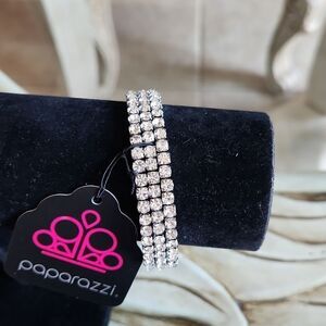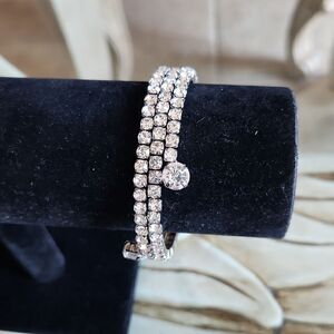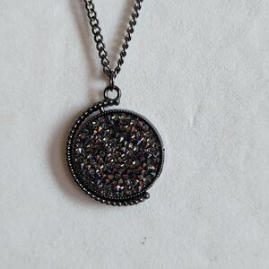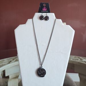 Gorgeous jewelry bundle with a gunmetal wrap around bracelet with clear rhinestones. The necklace is a medium length gunmetal with shimmering earrings and Gorgeous shimmering pendant the flips around.