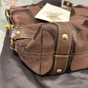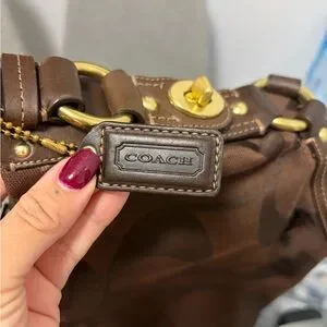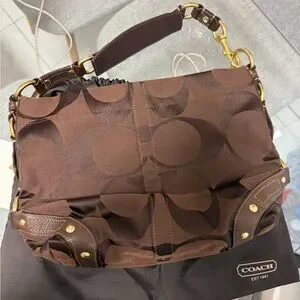 Stylish Coach shoulder bag in chocolate brown. Features signature pattern and gold-tone accents. Ideal for everyday use.