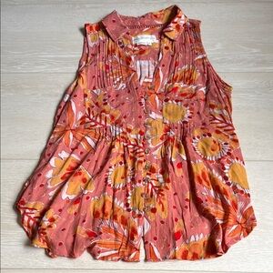 This Anthropologie blouse features a relaxed fit with stylish pleats and a notched collar, perfect for both casual and semi-formal occasions. Made from soft pink fabric, it offers comfort and sophistication with a buttoned front.