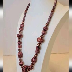 This stunning vintage necklace from Japan boasts a beautiful pinkish red color with berry pink tourmaline and berry color ceramic stone beads.