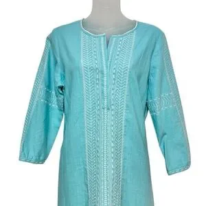 This elegant blue dress features intricate embroidery, perfect for any occasion. Its comfortable fit and stylish design make it a must-have addition to your wardrobe.