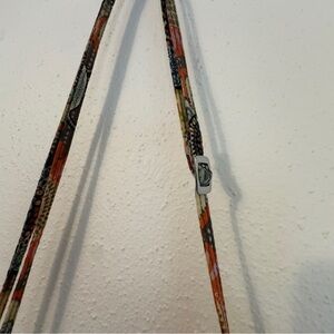 This shoulder bag showcases a lively floral pattern in orange and yellow hues, perfect for brightening up any ensemble. Its compact crescent shape and adjustable strap make it a stylish and practical choice for carrying essentials.