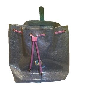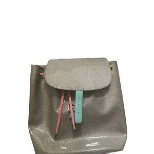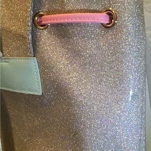 Color: Silver shimmer with pink and mint (or turquoise) accents on the straps and lining