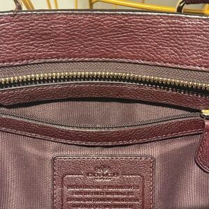 Luxurious Coach satchel with a fur finish. Dark red hue adds elegance. Perfect for stylish outings. Damage shown on back and side