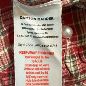 Discover charming style with this Damson Madder plaid shirt. This delightful button-up showcases a classic red plaid pattern enhanced with delicate ruffles along the placket and cuffs, adding a touch of feminine flair. Pearlescent buttons offer a sophisticated contrast, completing this eye-catching piece. Perfect for a casual day out, a weekend brunch, or a relaxed office environment.