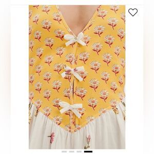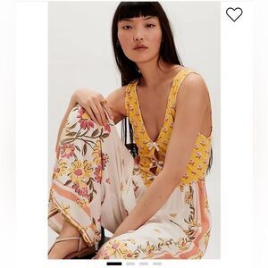This Free People jumpsuit features a deep V-neckline with a bow detail at the center and a tie detail at the back. It also has side pockets and flowy, slightly cropped, printed, straight legs.