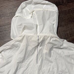 Lightweight white windbreaker. Features a hood and full zip closure. Ideal for outdoor activities. Excellent condition, no stains or holes.