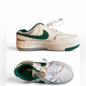 Step up your sneaker game with these stylish Nike Gamma Force shoes in the vibrant Malachite colorway. Featuring a clean white leather upper with bold green accents, these sneakers offer a modern twist on a classic court silhouette. The layered design and unique lacing system provide a secure and comfortable fit. Perfect for adding a pop of color to any outfit, these shoes are both fashionable and functional.