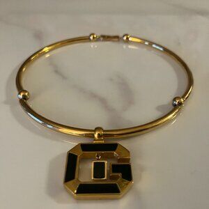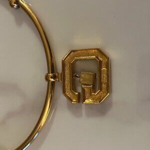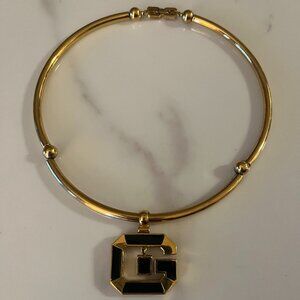 Bold, collectible vintage GIVENCHY statement necklace featuring a rigid gold-tone torque/collar with ball stations and an oversized octagonal “G” logo pendant with black enamel inlay. Signed GIVENCHY on the back of the pendant.