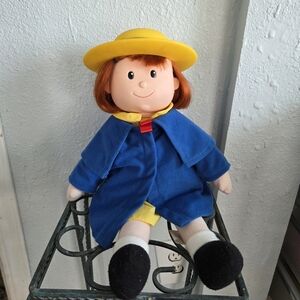 Adorable plush doll dressed in a vibrant blue coat and yellow hat.