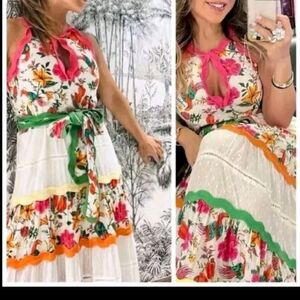Tropical floral maxi dress in a tiered design blending panels of bold tropical florals, multicolor scalloped trim and lace.