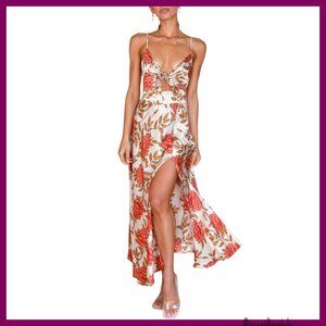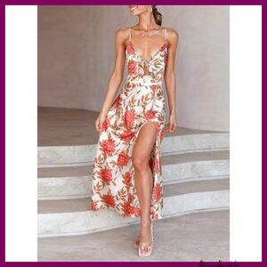 Spaghetti Strap Satin Midi Dress with Tie Front Backless Slit Cutout