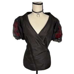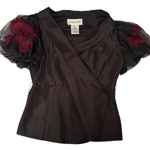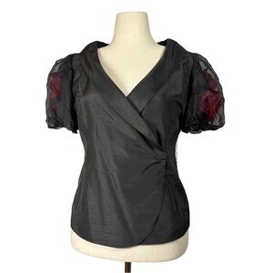 Victor Costa Black Wrap Top w/ Sheer Puff Sleeves & 3D Rose Detail | Size 10