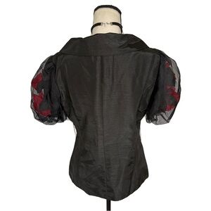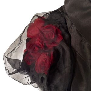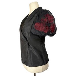 A striking statement blouse from Victor Costa, blending romantic drama with timeless tailoring. Features a silky black wrap style bodice with wide lapel collar and side closure. The showstopping detail is in the sheer organza puff sleeves, which encase dimensional faux red roses inside the fabric for a bold, sculptural effect. The waistline features string belt loops, originally designed for a coordinating belt, allowing you to style it with your own sash or belt for a cinched look. Fully lined through the body for structure and comfort.