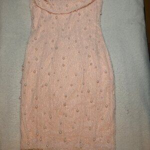 Stunning blush pink bodycon mini covered in pearl bead detailing throughout. Features a draped cowl neckline and delicate spaghetti straps. Figure-hugging fit.